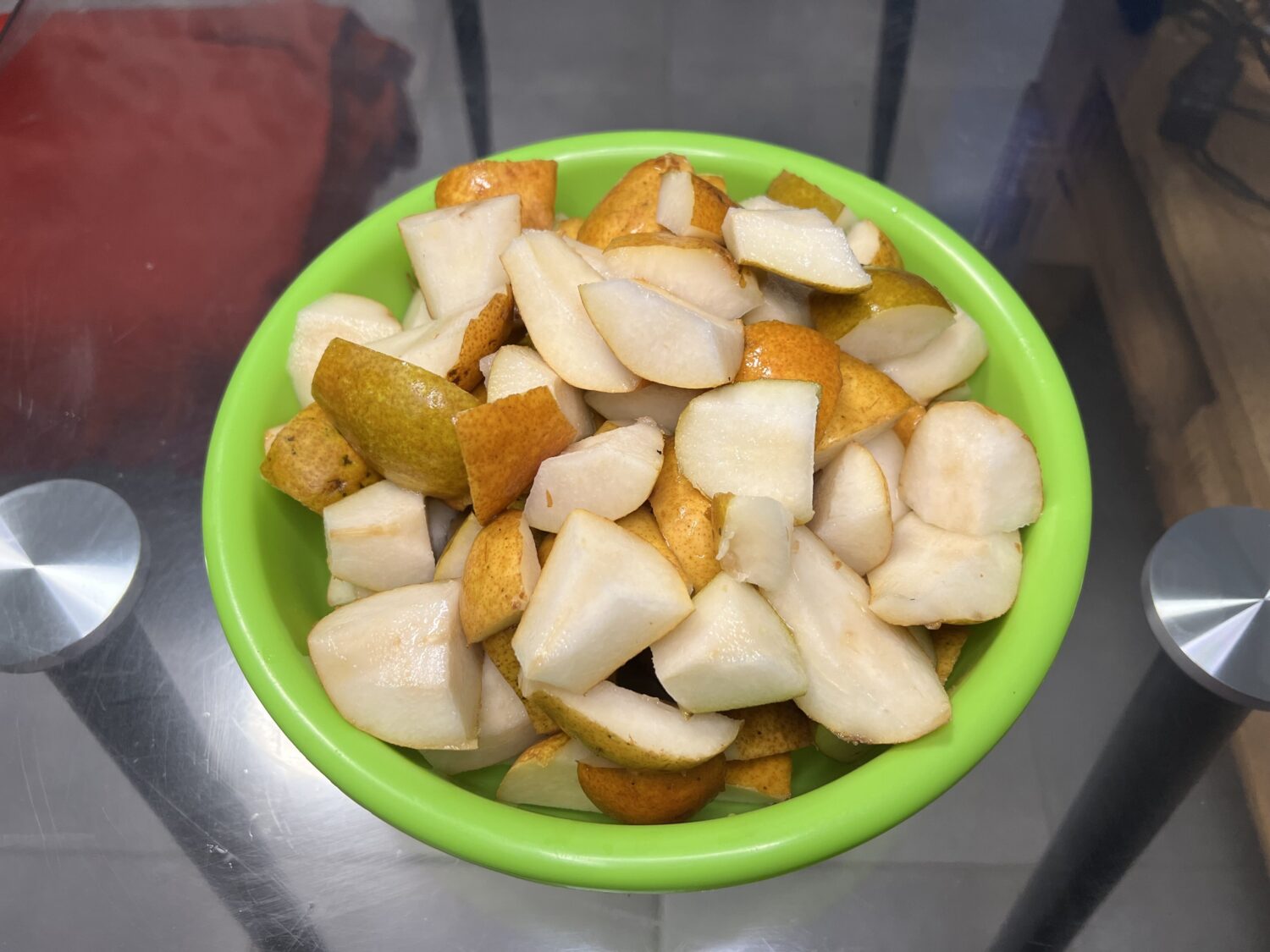 Сначала тщательно промойте груши под проточной водой. Груши очистите от сердцевины и нашинкуйте на небольшие кусочки.
