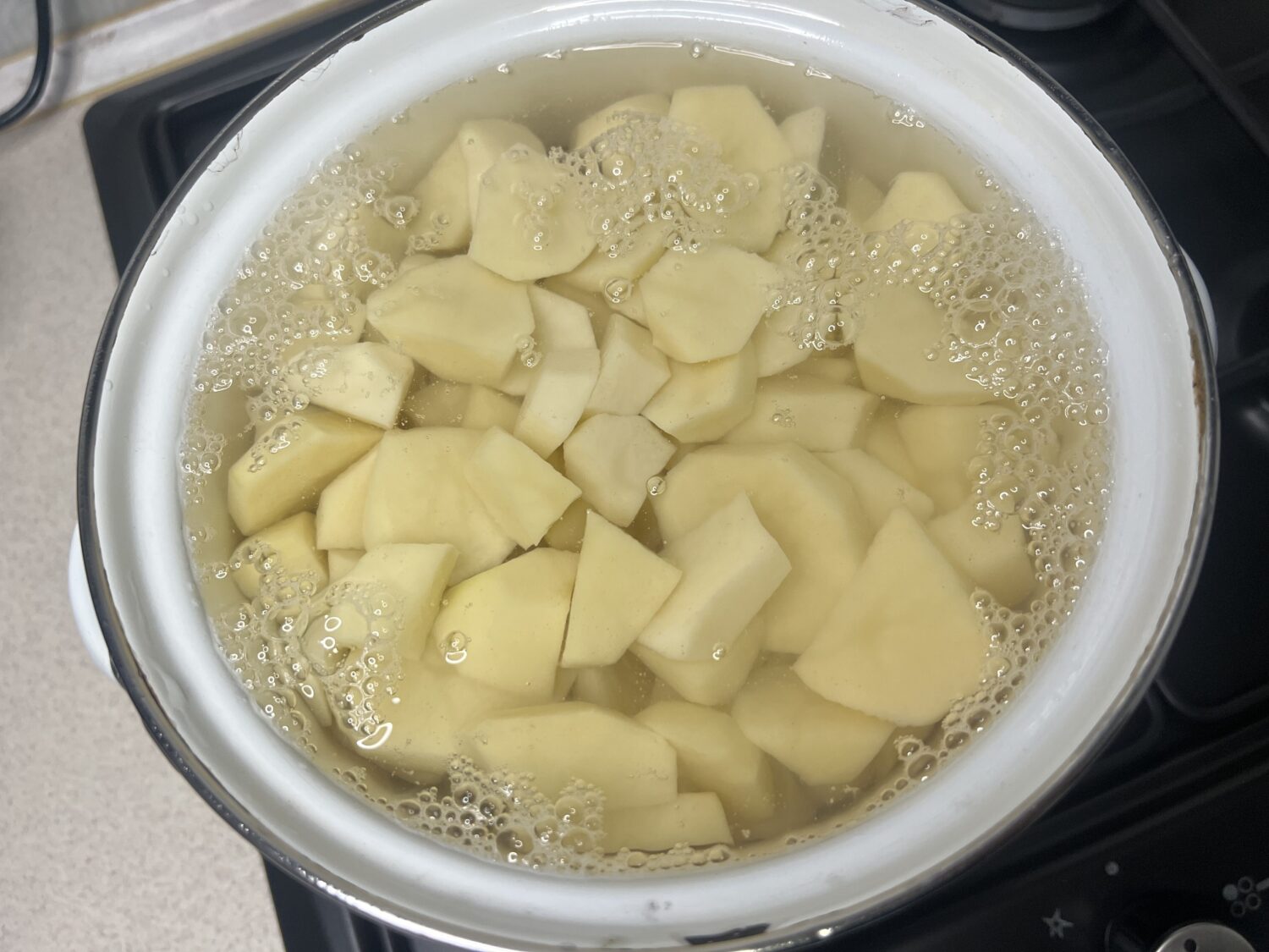 Положите картофель в большую кастрюлю, залейте холодной водой, добавьте соль. Варите на среднем огне около 20-25 минут до мягкости.