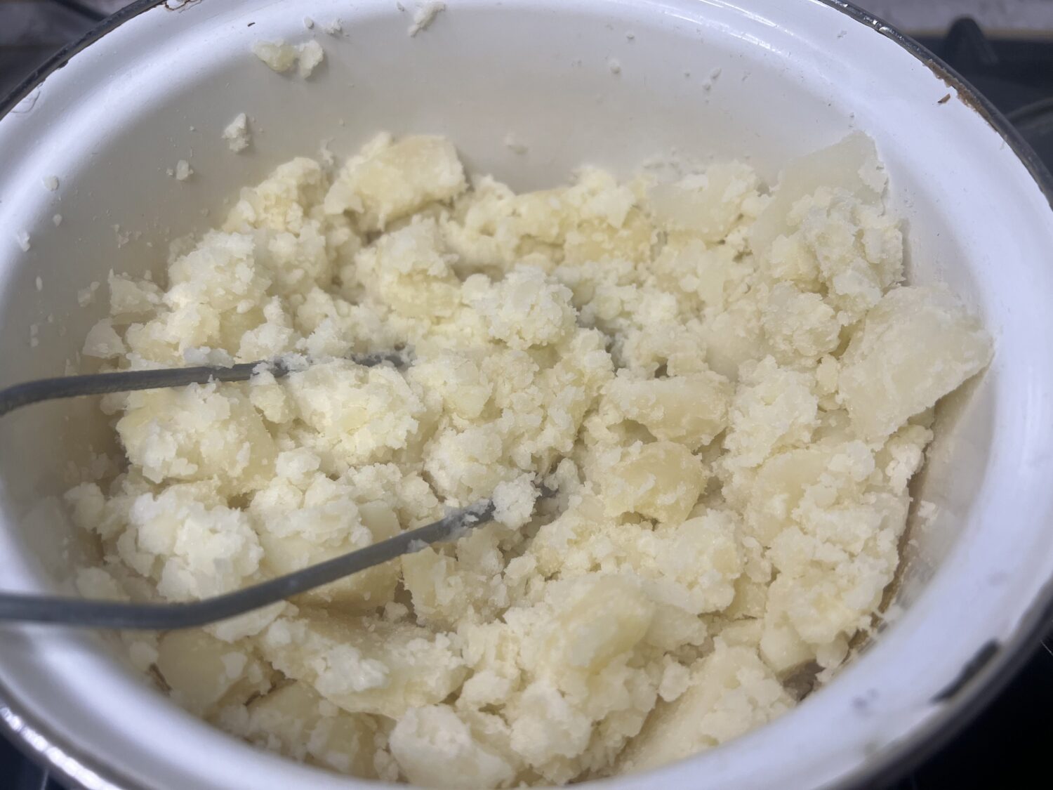 Слейте воду, оставив немного на дне кастрюли для сохранения влаги. Разомните картофель толкушкой до однородной консистенции.