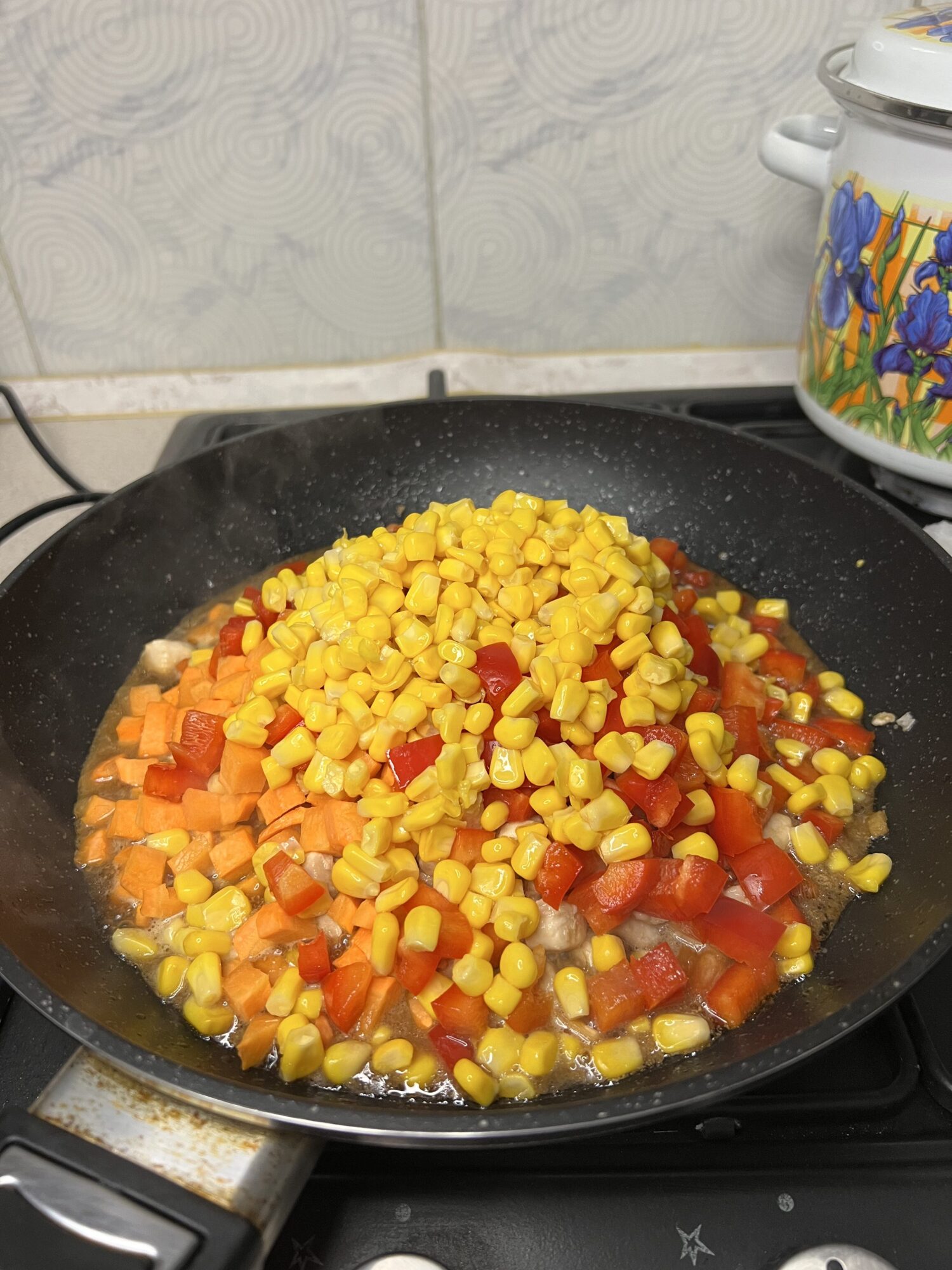 Добавьте к сковороде нарезанную кубиками морковь, болгарский перец, кукурузу и брокколи мелкими соцветиями. Обжаривайте овощи, постоянно помешивая, пока они не станут мягкими, но еще останутся хрустящими, примерно 5-7 минут.