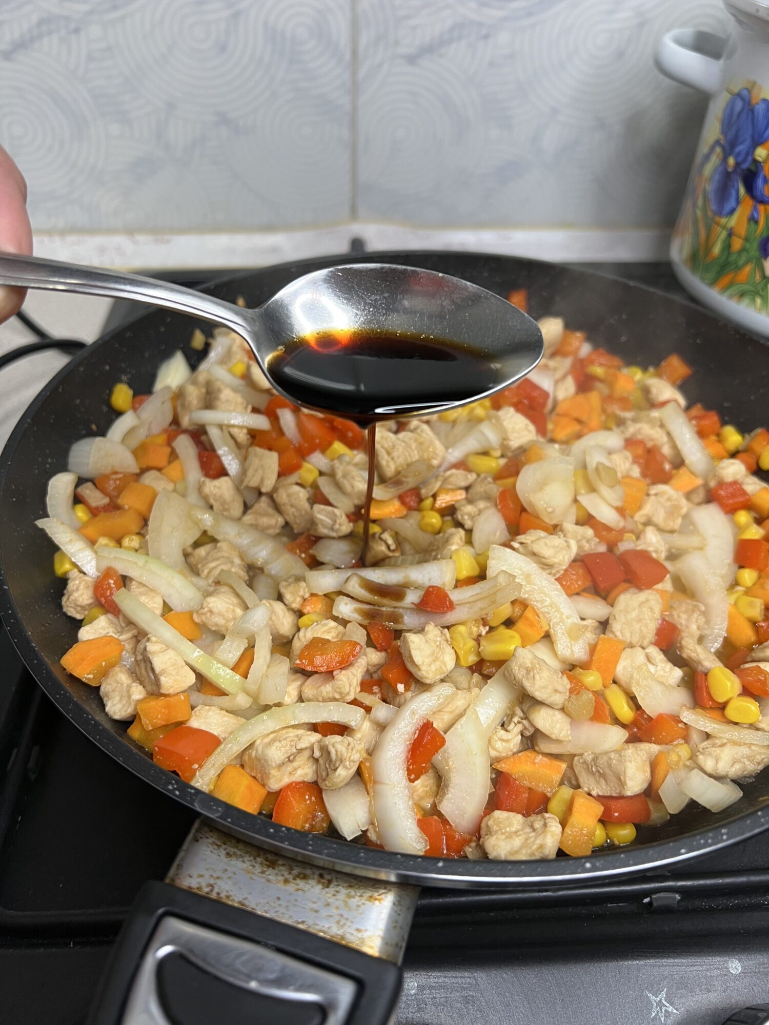 Влейте соевый соус в сковороду, добавьте кунжутное масло, соль и перец по вкусу. Хорошо размешайте, чтобы овощи равномерно покрылись соусом.