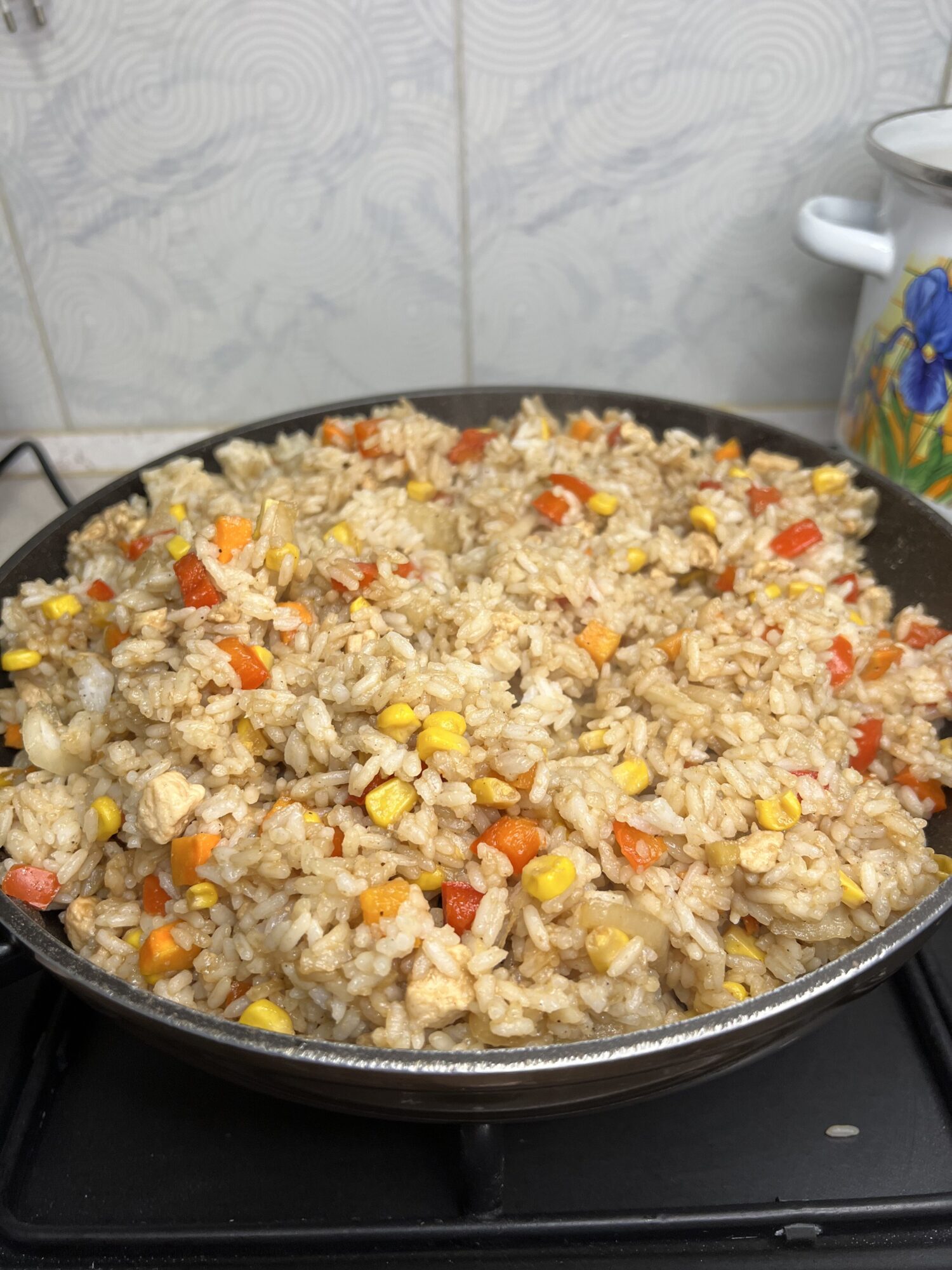 Добавьте готовый рис к овощам и тщательно перемешайте, чтобы все ингредиенты хорошо сочетались. Обжаривайте еще 2-3 минуты, чтобы блюдо хорошо прогрелось.